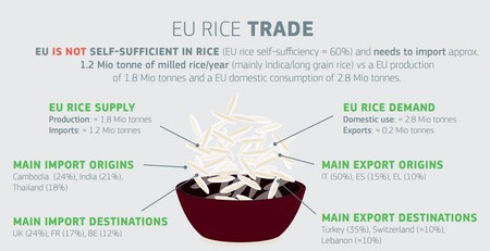 ¿Llega esa cantidad de arroz? La UE reconoce que no es autosuficiente en el cultivo de arroz y necesita importar toneladas de arroz cada año, especialmente de la variedad índica. Sus principales orígenes son Camboya, India y Tailandia, aunque la foto cambia ligeramente si hablamos del mercado español.