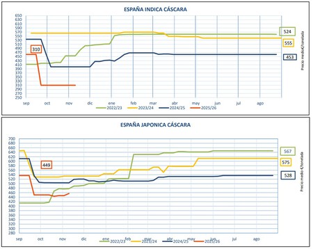Precios excepcionales. El mensaje fue transmitido con claridad. hace unas semanas Félix Liviano, presidente del sector arrocero de Cooperativas Agro-Alimentarias: «En Extremadura es probable que no podamos comercializar el 20% del arroz largo (variedad índica) que se produce porque hay tanto grano importado que en los mercados sale muy barato». En aquella época la variedad índica Cascara tenía un precio de 310 euros por toneladalejos de los 453 de 2024 o los 555 de 2023. datos actualizados MAPA muestra que tanto la índica como la japónica todavía están muy por debajo de los niveles de los últimos años.
