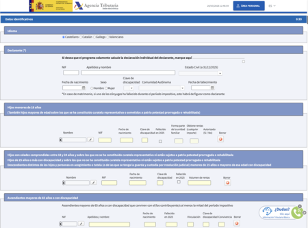 Cuando empieces uno nuevo, entrarás en la página de los datos identificativos. En ella, debes escribir tus datos personales, los de tu cónyuge si tuvieras, y los de tus hijos o personas mayores discapacitadas a tu cargo. Tras rellenarlo, debes pulsar en el botón Aceptar que tienes abajo del todo.