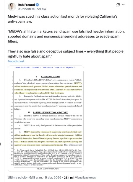 Si quieres clientes la clave es el spam. MEDVi también ha sido demandado en California por violar las leyes antispam de este estado. Según esa demanda, MEDVi utilizó una técnica de marketing de afiliación que enviaba spam utilizando información falsificada, dominios falsificados y direcciones de envío diseñadas para evitar los filtros de spam. Gallagher señaló en The New York Times que «se gastó un total de 20.000 dólares en el software y el primer mes de marketing», y no está claro cuánto del crecimiento inicial se debió a prácticas que ahora forman parte de ese nuevo proceso legal.