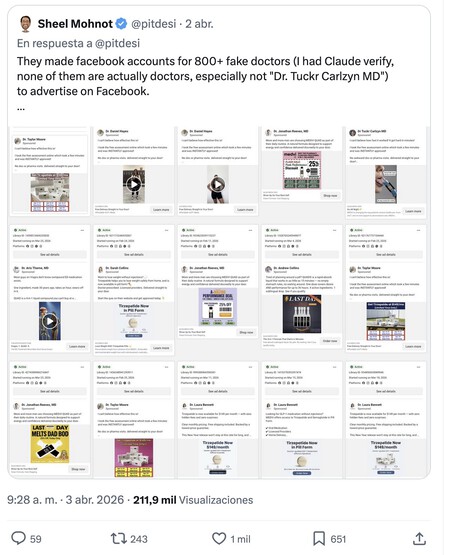 800 médicos falsos. Al crear MEDVi, Gallaguer creó más de 800 páginas de Facebook que se hacían pasar por perfiles de médicos individuales. El Dr. Daniel Foster, el Dr. Jacob L. Chandler o el Dr. Alistair Whitmore no existen: son perfiles creados por IA, con fotografías generadas con IA, y que precisamente sirven de apoyo a mujeres de entre 35 y 55 años en Facebook que quieren adelgazar para ver estos perfiles. El propio artículo del NYT comentaba que en el sitio web de MEDVi aparecieron fotos con modelos generados por IA y que algunos anuncios eran «AI Slop».