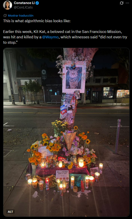 Un doble rasero. Según datos locales, los conductores humanos mataron a 43 personas en San Francisco el año pasado, incluidos 24 peatones. Como reflexiona el NYT en tu artículoLas autoridades locales estiman que cientos de animales mueren atropellados por vehículos cada año en la ciudad. Sin embargo, ninguno de esos casos ha generado el nivel de atención mediática, santuarios improvisados ​​o debates políticos que ha provocado la muerte de un solo gato a manos de un Waymo.