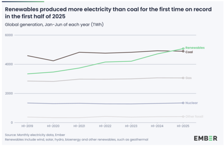 Las energías renovables produjeron más electricidad que el carbón por primera vez registrada en el primer semestre de 2025 | Ascua