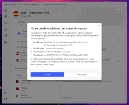 Conectarse a la VPN es una misión imposible. Además de tener que confirmar que confío en los certificados de red, es imposible aprovechar la red WiFi y tener la VPN activada. De hecho, escribo esto con la VPN desactivada, algo que me da cierto respeto en una red pública.