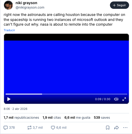 Por qué es importante. La misión Artemis II es histórica y la corriente ha dejado para la posteridad sus primeras horas de vuelo y esta anécdota que constituye el que probablemente sea el primer ticket de soporte técnico de Microsoft generado desde el espacio. Más allá de la broma, el episodio muestra que la exploración espacial actual y su tecnología de punta coexisten con el software de productividad comercial y sus fallas comunes. Cuando una agencia estandariza toda su infraestructura en un único ecosistema tecnológico, los problemas de ese ecosistema también se convierten en problemas de la misión.