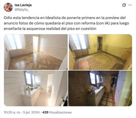 Anuncios más llamativos. En la descripción de los anuncios que reportan los usuarios advierten que se ha utilizado IA para retocar algunas imágenes, pero lo que suelen hacer es poner primero las imágenes con IA para llamar la atención de los interesados. Una vez dentro del anuncio, te encuentras con la realidad: la casa se esta cayendo a pedazos. Si así lo especifican en la descripción y luego ponen las fotos reales, técnicamente no es una estafa, pero sí una estrategia bastante turbia que añade otra capa de dificultad a la ya difícil tarea de encontrar una casa para comprar o alquilar.