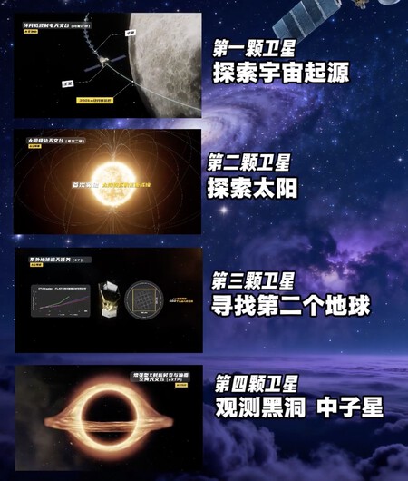Entre estas misiones se encuentra un experimento de radioastronomía para estudiar objetos celestes midiendo sus emisiones de radio, en este caso destinado a comprender mejor la cara oculta de la Luna; un observatorio solar que investigará condiciones meteorológicas como el viento solar o las tormentas geomagnéticas, la construcción de un telescopio espacial que vigilará los agujeros negros y las estrellas de neutrones y un satélite cazador de Planetas fuera del sistema solar. Este último tiene un objetivo ambicioso: buscar un planeta análogo a la Tierra.