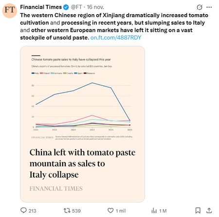 Los datos son bastante elocuentes. Sólo durante el tercer trimestre de 2025 disminuyeron las ventas de pasta de tomate china en Italia alrededor del 80%.