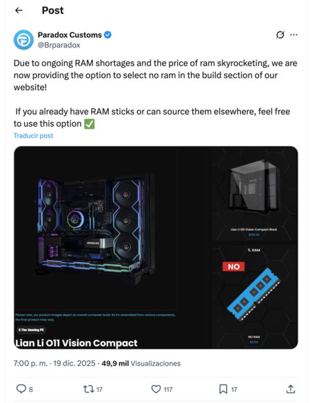 La señal más clara de este cambio ha llegado de la mano de Paradox Customs, un integrador fundado en 2019 en Deer Park (Nueva York) que ha apostado por algo poco habitual: permitir al cliente configurar un ordenador sin memoria RAM. La empresa lo explica en su cuenta en XDebido a la continua escasez y el aumento de los precios, ofrece la opción de seleccionar «sin RAM» en el proceso de compra. También lo presenta, para quienes ya tienen módulos o pueden obtenerlos por su cuenta, una forma directa de superar un mercado que ya no garantiza un suministro estable a precios predecibles.
