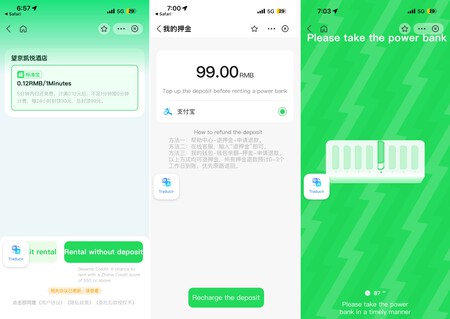 El precio es de 0,12 yuanes por minuto (unos 0,014 euros), pero como no tengo cuenta bancaria en China, tuve que pagar un depósito de 99 yuanes (unos 12 euros). Tan pronto como pagué, la aplicación me dijo qué powerbank tenía que quitar y la propia estación hizo que el LED de batería correspondiente parpadeara. Para cargar.