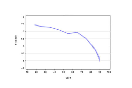 La felicidad tiene forma de U. «La felicidad es una pendiente resbaladiza hasta que tocamos fondo en algún punto indeterminado de la mediana edad. A partir de ahí, vuelve a subir a los niveles de la juventud». Eso es lo que dije un estudio de 2008 que Blanchflower y Oswald con datos de más de medio millón de personas.