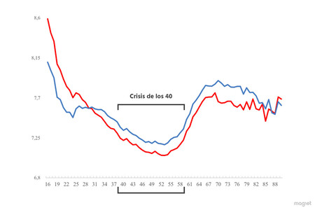 O, tal vez, una estrategia. Porque, en definitiva, «hay mucha evidencia sobre cómo los humanos experimentan una fagot psicológico en la mediana edad» (Blanchflower y Oswald, 2007; Steptoe, Deaton y Stone, 2015; Graham y Pettinato, 2002), pero hay muy poco sobre la relación entre esa crisis -esa infelicidad- y la calidad de vida.