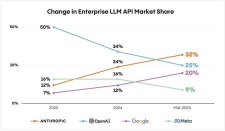 Adelanto por la derecha. El datos de esa empresa Las empresas de capital riesgo revelan que a principios de 2023 OpenAI dominaba el segmento empresarial con sus modelos de IA: tenía una cuota del 50%, cuando Anthropic apenas contaba con el 12%. En julio la situación había cambiado radicalmente, y mientras OpenAI había reducido su cuota al 25%, Anthropic había conseguido aumentarla hasta el 32%.