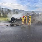 El automóvil de 22 ruedas, que transportaron más de 30.000 litros de lechefue atropellado por una motocicleta que, al parecer, tras chocar frontalmente con el auto familiar, explotó e inmediatamente envolvió en llamas la cabina del tractocamión, que al parecer cayó encima del auto, el cual terminó incinerado junto con sus dueños y sus dos perros.