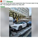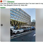 Dos Bugatti Chiron aparcados ante la puerta del hotel de lujo, flanqueados por un enorme Mercedes-AMG G 63 6×6 y un Rolls-Royce Cullinan.
