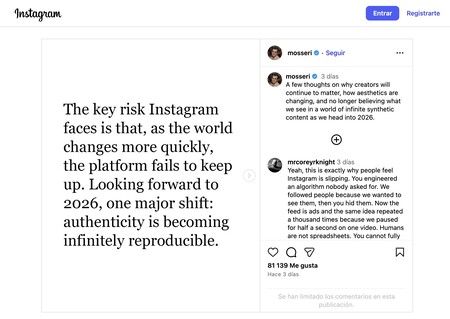 Para Mosseri, la IA ha convertido la cuadrícula cuidadosamente mantenida con su algoritmo en algo del pasado: «A menos que tengas menos de 25 años y uses Instagram, probablemente pienses en la aplicación como un feed de fotos cuadradas. La estética está cuidada: mucho maquillaje, suavizado de la piel, fotografías de alto contraste, hermosos paisajes», la frase de Mosseri cae como una piedra sobre este millennial, que todavía usa Instagram como una especie de álbum de fotos. «Ese feed está muerto. La gente dejó de compartir momentos personales en el feed hace años».